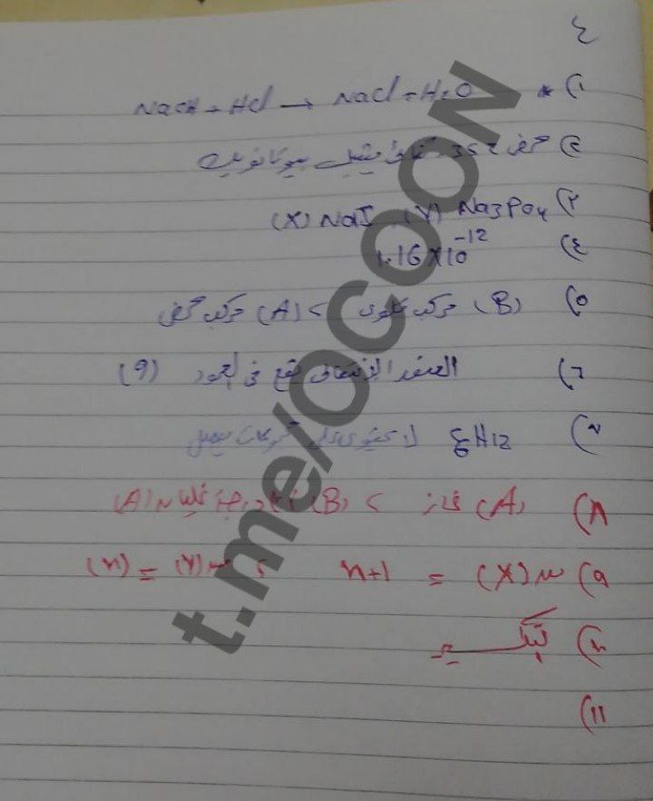 1/حمض البكريك 2/كحول ثانوي فقط 3/ Ni 4/ب 5/ A فينول 6/٤.٥ 7/ء 8/أخضر 9/ مساوية لحجم القلوي 10/ تقل قيمة Ph 11/ زيادة العامل الحفاز 12/ ج 13/ سحب الاكترونات من B الي A 14/ اسيتات الفينيل 15/ منظف صناعي 16/ العنصر c كعامل حفاذ 18/ ب 19/ ء 20 / ب ٢١ / التوتر السطحي 25/ج 26/b محلول غاز في ملح 27/W+ 28/48.7 29/ء 30/ Hcl 31/ ب 32/ التفاعل يحتاج ااي تسخين 33/التفكك الحراري _ الأكسدة _ التفاعل