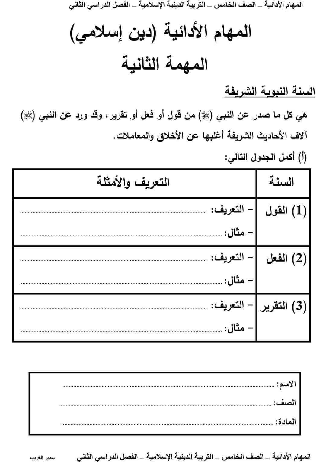 المهام الادائية الرسمية دين اسلامى ترم تانى الصف الخامس 2023